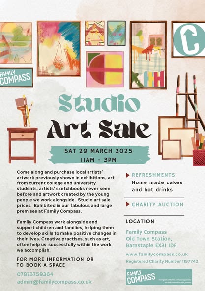 Join us on March 29th, from 11 AM to 3 PM at Family Compass, North Walk, Barnstaple, Devon EX31 1DF, for an incredible Studio Art Sale, featuring work from talented local artists and emerging talents.